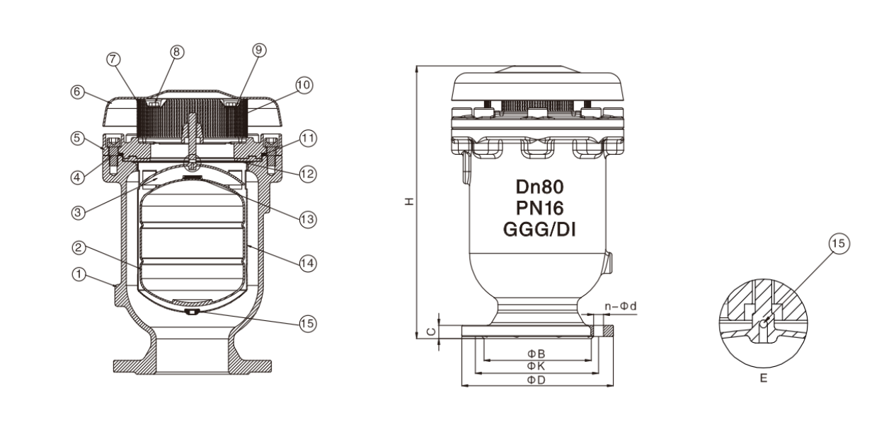 CARX复合式排气阀设有一大 一小两孔,大孔通径与孔径基本相同,管道通水有大量气体往外排,这些气体将从大孔排出。当气体排完后,大孔,管道在正常运转时,管内自然会产生气囊体,这些气体会慢慢形成变大,然后集中到管道上部,对管道的出水量有一定影响,这些气体由小孔解决排出,以确保管道内无气体存在。如果出现停电、停泵,管内水流空时会出现负压,这时管内需要大量的空气,复合式排气阀的浮球顺水下降,打开大孔进行大量进气确保管道安全。